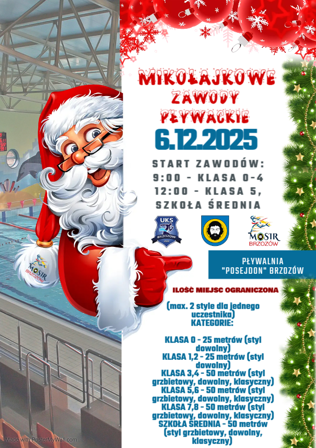 Mamy przyjemność ogłosić, że w dniu 6.12.2025r. (sobota) na pływalni „Posejdon” w Brzozowie odbędzie się kolejna edycja Mikołajkowych Zawodów Pływackich. Zawody będą odbywać się w kilku kategoriach wiekowych: dla klas 0-4 od godziny 9:00 oraz dla klas 5-8 i szkoły